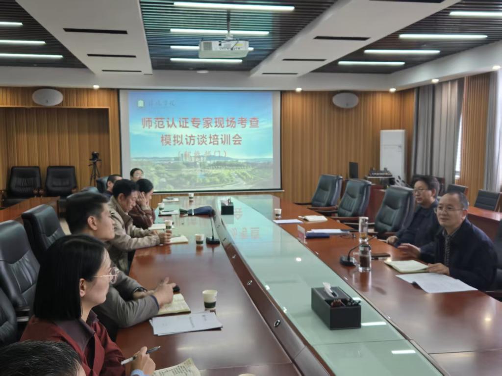 为扎实做好师范专业认证专家进校现场考查准备工作,10月10日至11日,学校在综合楼1412会议室召开师范专业认证专家进校现场考查模拟访谈培训会。培训共安排3场,区分学院和职能部门两个层次,由教育部师范专业认证专家、学校教师教学发展中心主任孟宪乐教授进行培训指导,英语专业、数学与应用数学专业部分任课教师和拟接受认证专业所在学院领导、相关职能部门负责人参加了培训。